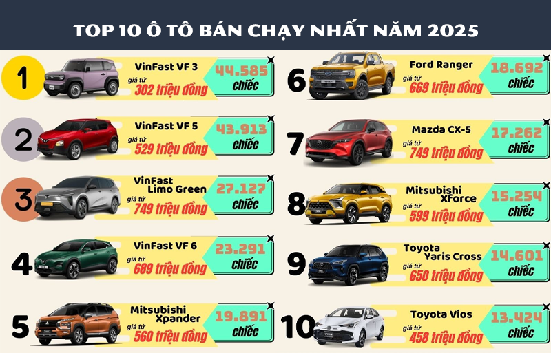 Bất chấp những tác động từ nền kinh tế, thị trường ô tô năm 2025 vẫn có nhịp tăng trưởng nhờ các chính sách hỗ trợ từ Chính phủ và các nỗ lực kích cầu của nhà sản xuất. Điểm nhấn lớn nhất của năm 2025 chính là sự thống trị tuyệt đối của các dòng xe điện VinFast, cùng với đó là sự trỗi dậy của dòng xe gầm cao. Danh sách 10 mẫu xe bán chạy nhất năm cho thấy sự áp đảo của xe điện và xe gầm cao (SUV/MPV), trong khi đó dòng sedan truyền thống chỉ còn duy nhất một đại diện xếp ở vị trí cuối bảng.