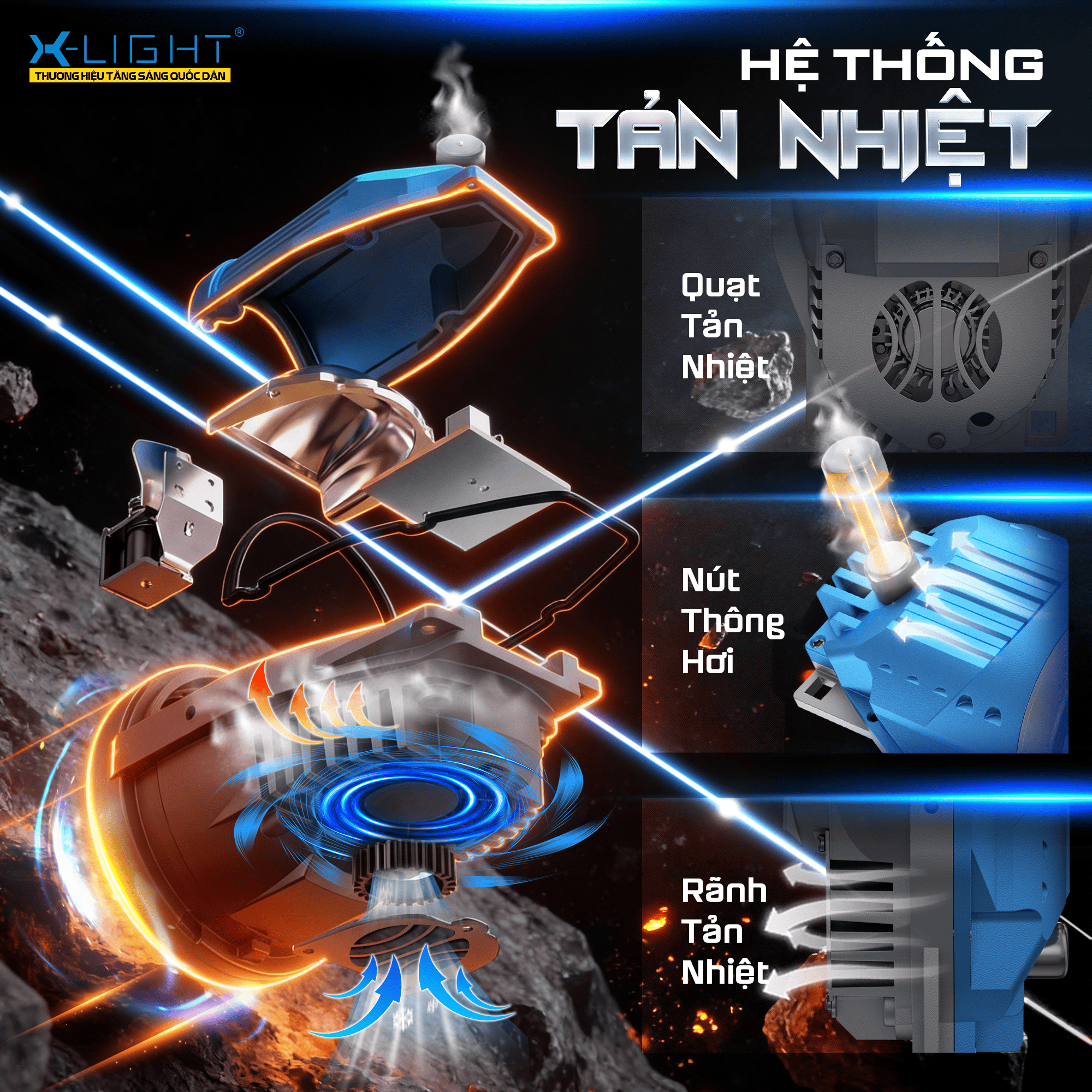 X-Light cũng đưa công nghệ tản nhiệt chủ động của những dòng đèn bi gầm mới vào sản phẩm bi gầm 301 V2 để tối ưu khả năng vận hành. Nhờ cơ chế hoạt động riêng biệt, quạt vẫn luôn quay trong những tình huống xe phải dừng chờ đèn đỏ hoặc di chuyển tốc độ thấp. Thiết kế này không chỉ giúp duy trì hiệu suất chiếu sáng của đèn mà còn hỗ trợ cho quá trình sửa chữa nếu phần quạt gặp vấn đề mà không cần thay thế toàn bộ đèn xe.