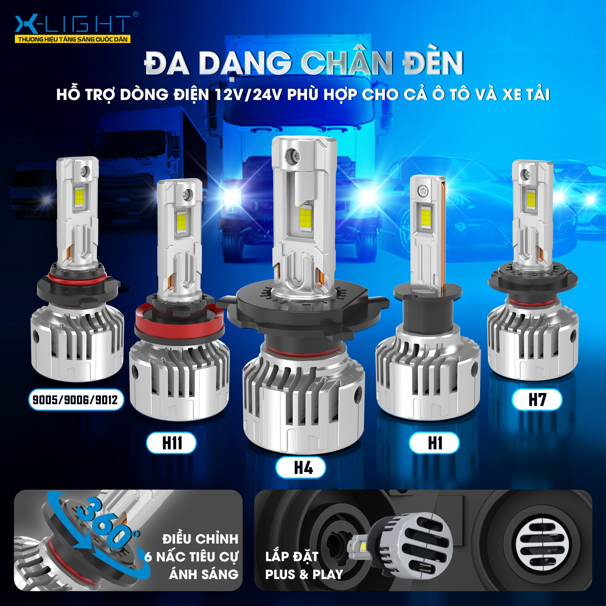 Bên cạnh đó, sản phẩm được cung cấp đa dạng phân loại chân đèn gồm H1, H4, H7, H11, 9005, 9006 và 9012, cho phép người dùng dễ dàng lựa chọn phiên bản phù hợp với từng mẫu xe. Chỉ cần chọn đúng chân đèn tương thích, quá trình lắp đặt trở nên đơn giản và chính xác, có thể tự lắp đặt tại nhà.