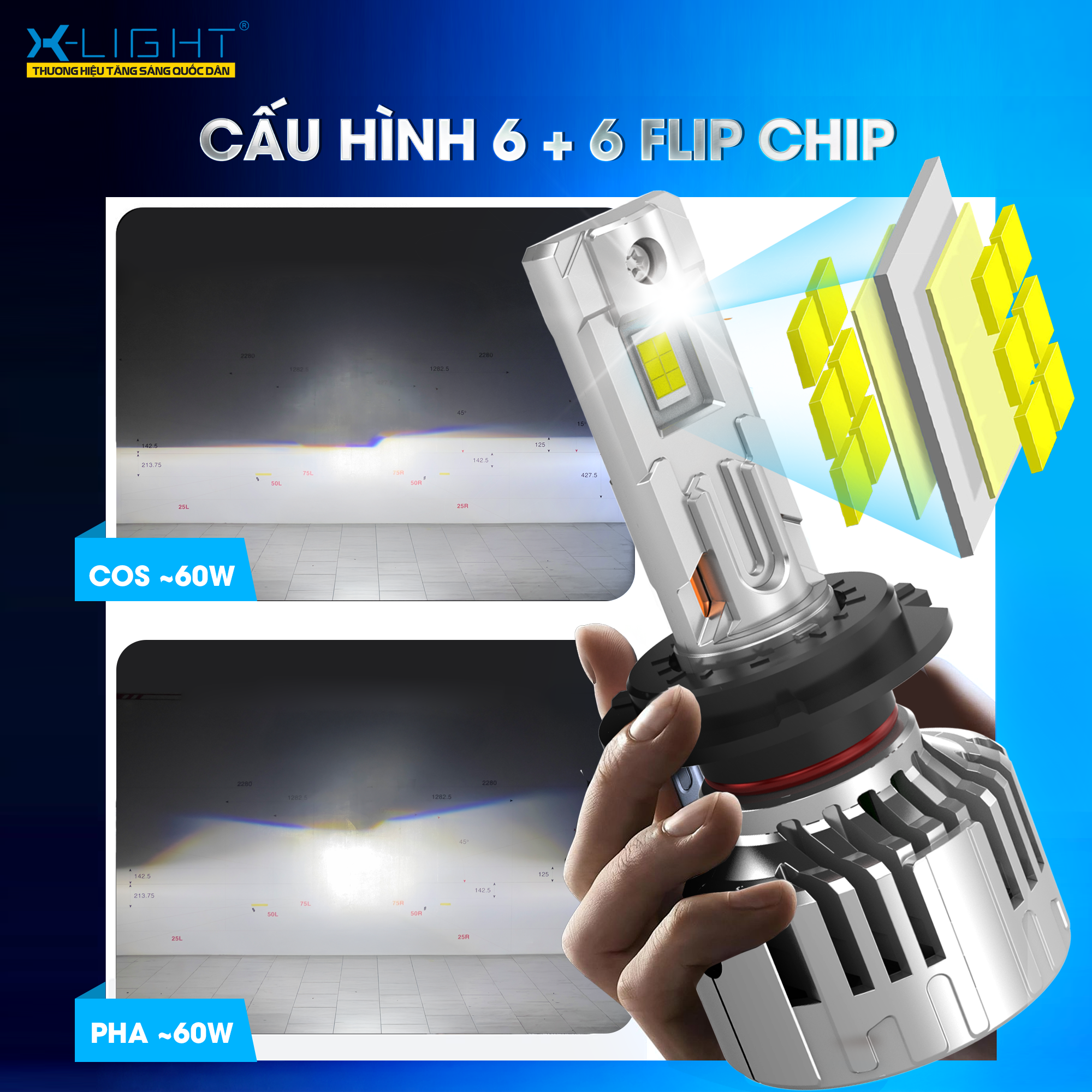 Bóng LED X-Light S3 Pro V2 sử dụng cấu hình 6+6 chip LED Flip Chip cao cấp, riêng phiên bản chân H4 được trang bị đến 12+12 chip nhằm đảm bảo hiệu quả chiếu sáng phù hợp với từng kiểu chóa đèn. Toàn bộ chip LED đều thuộc dòng Flip Chip, giúp tối ưu hiệu suất phát sáng và tạo vùng ánh sáng tập trung, cho khả năng quan sát rõ ràng và ổn định khi di chuyển.