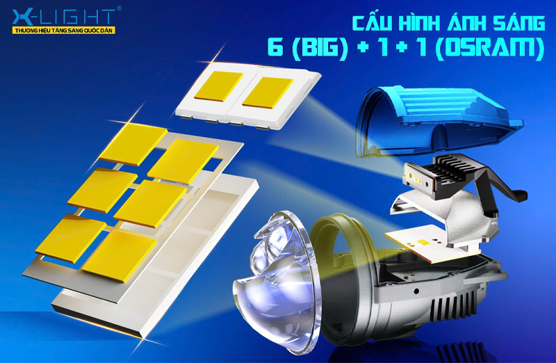 Đèn được trang bị cấu hình 6 chip LED có độ bền cao, giữ hiệu suất chiếu sáng tốt để tạo vùng ánh sáng Cos. Các chip LED này khi hoạt động có công suất khoảng ~45W, tạo vùng ánh sáng đậm và dày phía trước đầu xe. Kết hợp với chóa phản xạ thế hệ mới, sản phẩm giúp tăng độ phủ sáng rộng sang hai bên mặt đường, nhờ đó cung cấp một tầm nhìn rõ ràng và hạn chế tối đa vùng tối phía đầu xe.