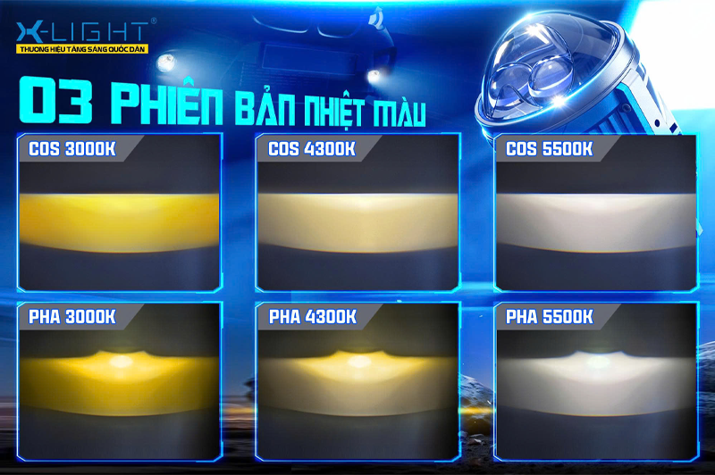 Đèn bi gầm X-Light F10 Turbo V2 được trang bị ba phiên bản nhiệt màu gồm 3000K, 4300K và 5500K, giúp chủ xe dễ dàng lựa chọn ánh sáng phù hợp với điều kiện di chuyển thực tế. Mỗi mức nhiệt màu đều có đặc tính riêng, phục vụ những nhu cầu sử dụng khác nhau thay vì chỉ tập trung vào yếu tố thẩm mỹ.