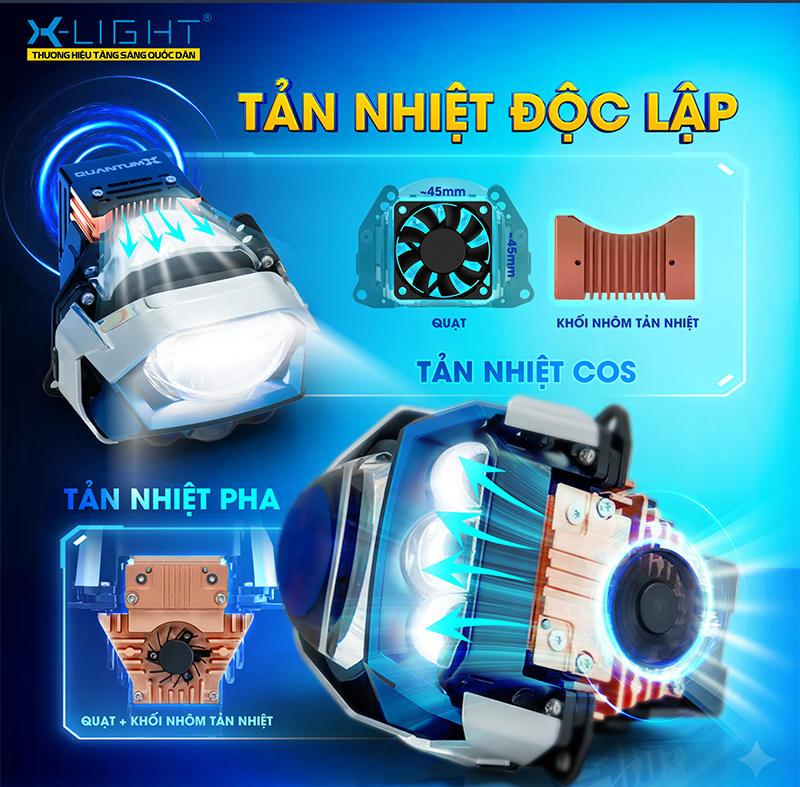 Đèn bi LED X-Light Quantum X được trang bị hệ thống tản nhiệt được tối ưu hóa theo từng chế độ chiếu sáng, giúp duy trì hiệu suất ổn định trong suốt quá trình vận hành. Ở cụm 9 chip LED chính, sản phẩm sử dụng khối nhôm kết hợp quạt làm mát đặt tại phần đuôi đèn, cấu trúc quen thuộc trong lĩnh vực nâng cấp đèn ô tô nhưng được tinh chỉnh để đạt hiệu quả thoát nhiệt nhanh và ổn định hơn.