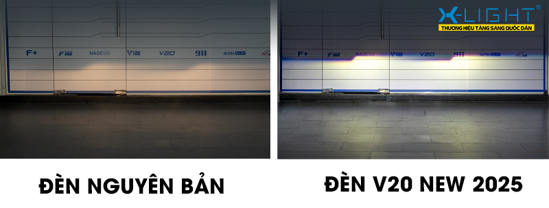 Khi đặt đèn nguyên bản của Mazda 3 và đèn bi LED X-Light V20 New 2025 sau khi nâng cấp trên xe, dễ dàng thấy được sự khác biệt về hiệu suất, vùng được chiếu sáng, độ đậm. Đèn zin của xe có ánh sáng vàng nhạt, vùng chiếu sáng tương đối hẹp và ngắn. Trong khi đó, bi LED V20 New 2025 mang lại hiệu suất cao hơn, dải sáng phủ đều từ tâm đến hai bên, giúp người lái dễ nhận diện chướng ngại vật trên đường.