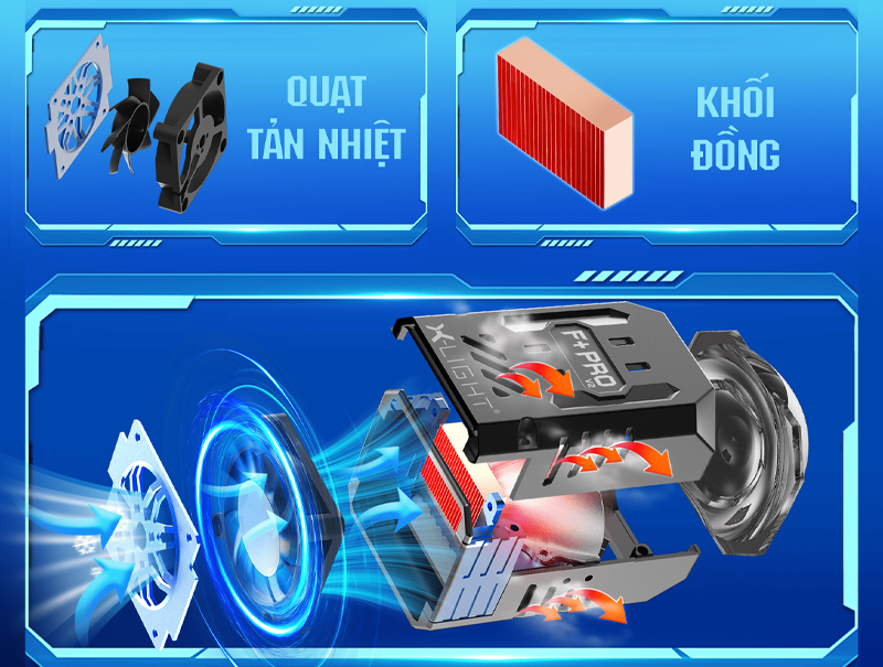 Cơ chế tản nhiệt toàn diện với khối đồng và quạt, yên tâm về khả năng làm mát đèn
