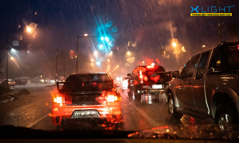 - Chỉ sử dụng đèn định vị hoặc đèn ban ngày: Trong điều kiện mưa lớn, mật độ hạt nước dày làm giảm đáng kể tầm nhìn xa. Nếu chỉ bật đèn định vị hoặc đèn ban ngày, xe sẽ không đủ sáng để các phương tiện khác nhận diện từ xa, đặc biệt trong môi trường ánh sáng yếu, từ đó làm tăng nguy cơ mất an toàn khi di chuyển.