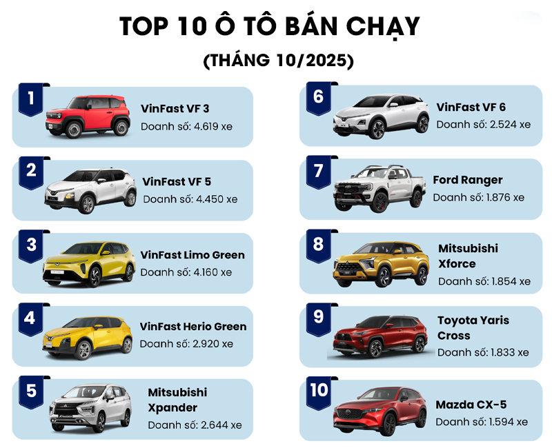 Mitsubishi Xpander là chiếc xe duy nhất không phải của VinFast lọt vào top 5 với doanh số 2.644 chiếc, nhiều hơn 852 chiếc và tăng 2 bậc so với tháng 9. Phần còn lại là những mẫu xe quen thuộc như Ford Ranger (1.876 xe); Mitsubishi Xforce (1.854 xe); Toyota Yaris Cross (1.833 xe) và Mazda CX-5 (1.594 xe).