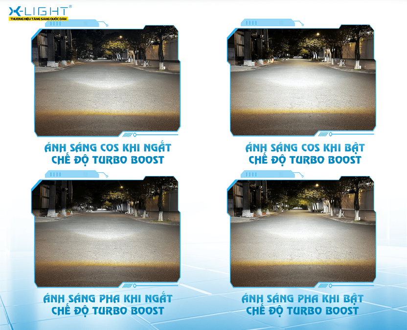 Giống với các dòng đèn thuộc dòng bi LED V20 của X-Light, V20 New 2025 cũng được tích hợp tính năng Turbo Boost. Đây là một tính năng vô cùng hữu ích để tối ưu vùng ánh sáng trong từng điều kiện di chuyển khác nhau. Khi di chuyển ở ngoại thành, chất lượng ánh sáng vượt trội của bi LED V20 New 2025 sẽ mang lại vùng quan sát rõ ràng hơn.