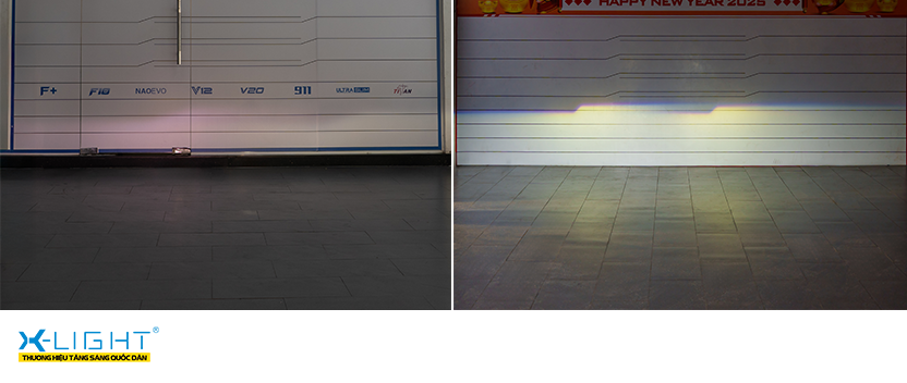 Khi đặt đèn nguyên bản của Toyota Camry 3 và đèn bi LED X-Light V20 New 2025 sau khi nâng cấp trên xe, dễ dàng thấy được sự khác biệt về hiệu suất, vùng được chiếu sáng, độ đậm. Đèn zin của xe có ánh sáng vàng nhạt, vùng chiếu sáng tương đối hẹp và ngắn. Trong khi đó, bi LED V20 New 2025 mang lại hiệu suất cao hơn, dải sáng phủ đều từ tâm đến hai bên, giúp người lái dễ nhận diện chướng ngại vật trên đường.