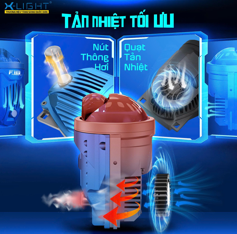 Ở mỗi chế độ, X-Light đều trang bị riêng một hệ thống tản nhiệt, giúp duy trì hiệu suất chiếu sáng ổn định trong suốt quá trình vận hành. Ở cụm 9 chip LED chính, sản phẩm sử dụng khối nhôm kết hợp quạt làm mát đặt tại phần đuôi đèn, cấu trúc quen thuộc trong lĩnh vực nâng cấp đèn ô tô nhưng được tinh chỉnh để đạt được hiệu quả thoát nhiệt nhanh và ổn định hơn.